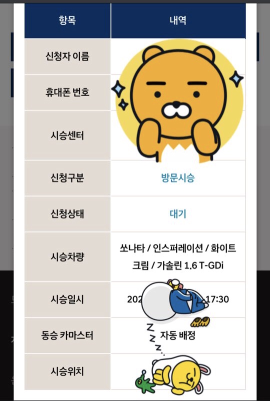 시승모델과 시승센터를 선택하고 나면, 예약가능한 시간이 나온다. 모든 예약이 완료된 후에는, 비회원 신청조회에 들어가 예약이 정상적으로 완료됐는지 다시 한번 확인한다.