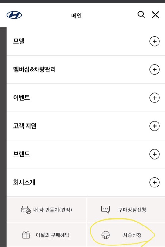 그 다음으로, 오른쪽 상단 메뉴를 클릭하면 가장 하단에 ‘시승신청’메뉴가 있다. 클릭!