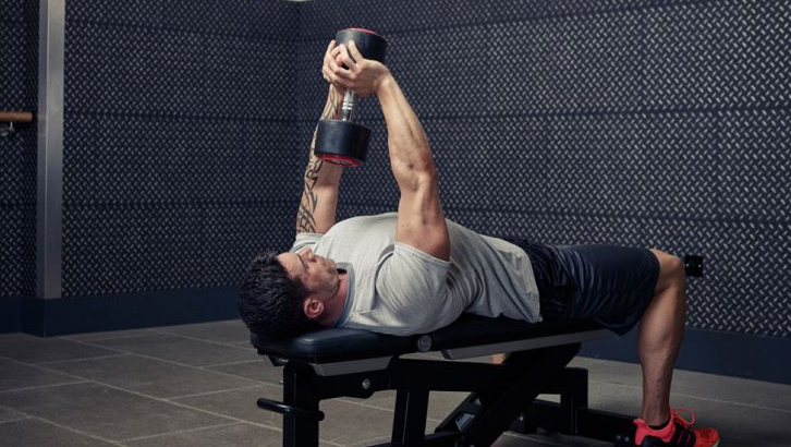 2. 벤치에 누워 허리를 살짝 띄우고 덤벨을 얼굴 위로 들어올린다.