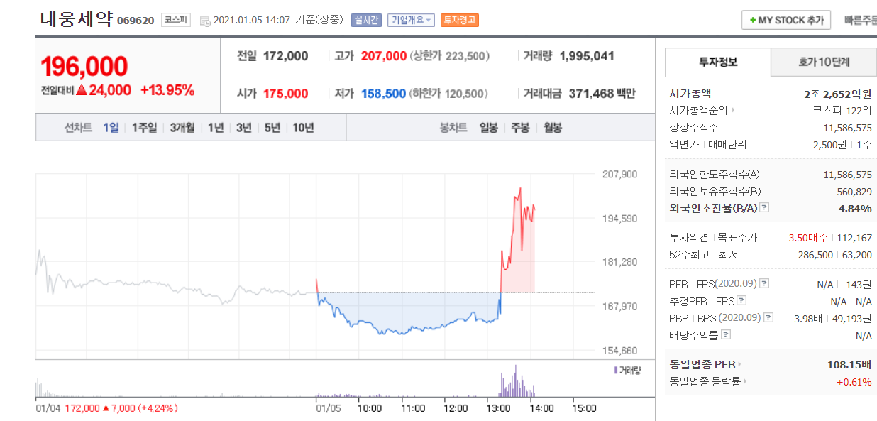 금일 코로나19 치료제 관련 기대감으로, 대웅제약 주가가 크게 상승하였습니다.
