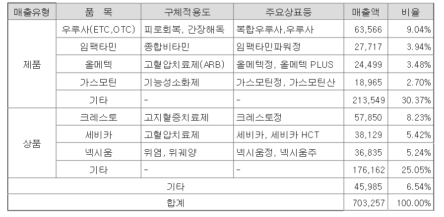단일 제품 중 가장 큰 매출액은 역시 우루사(ETC, OTC)이며 그 다음은 종합비타민 임팩타민이네요.