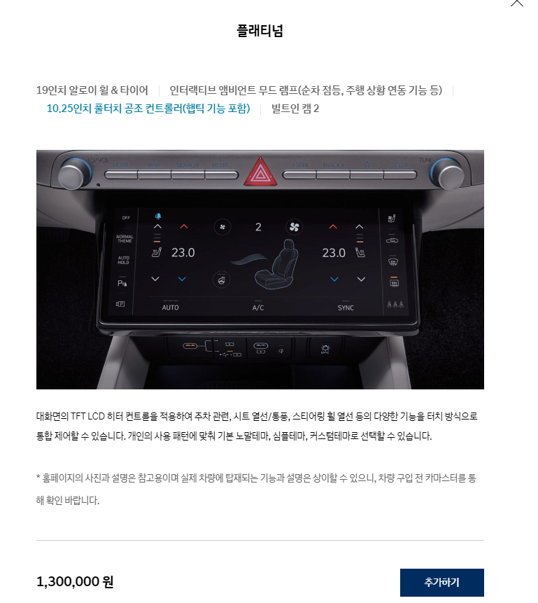 - 10.25인치 풀터치 공조 컨트롤러(햅틱 기능 포함) : 해당 옵션을 넣지 않으면 완전 택시 같습니다. 풀터치 공조는 반드시 넣어야 합니다.
