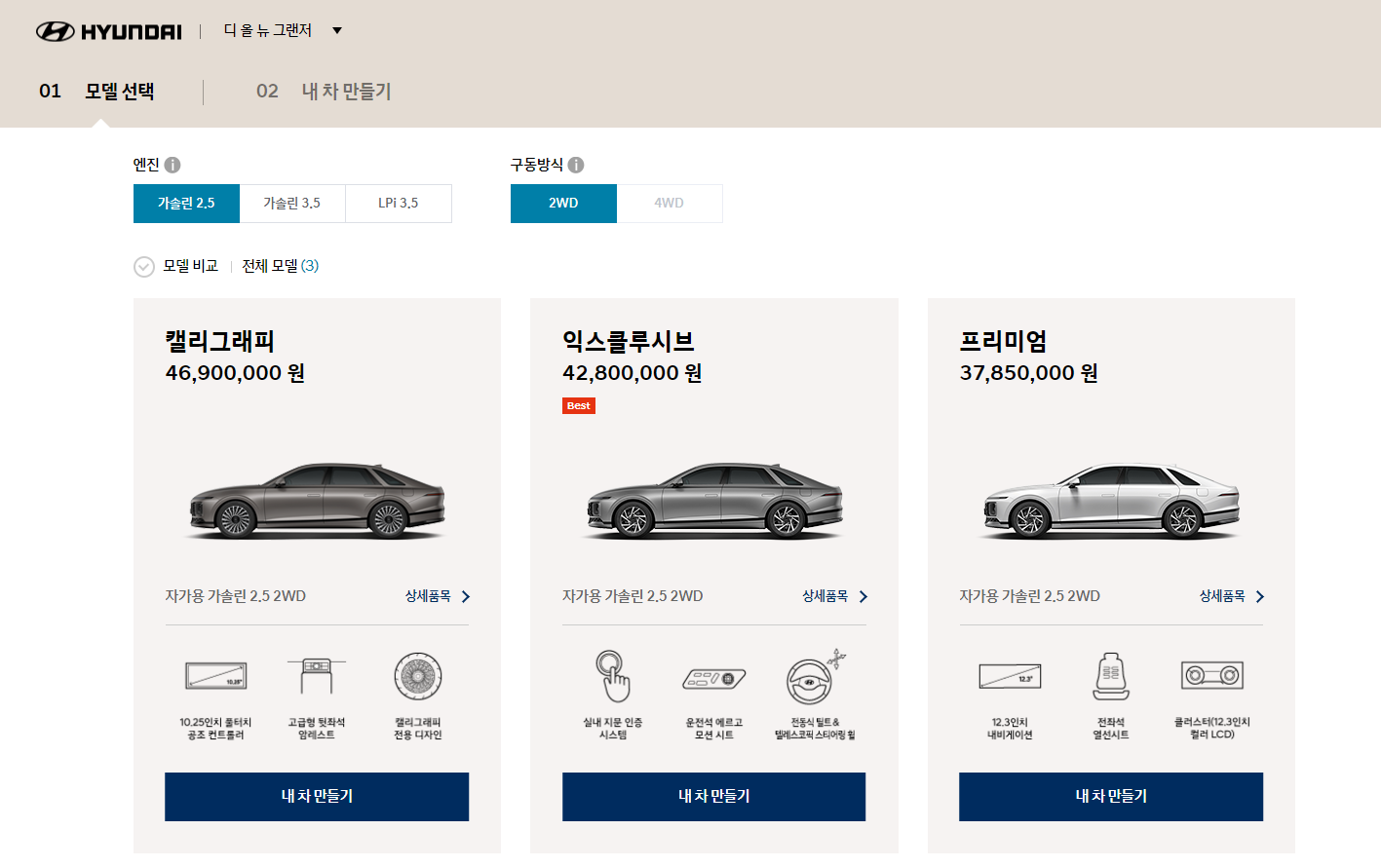 그랜저는 중대형 세단인만큼, 선택할 수 있는 트림이 많지 않습니다.